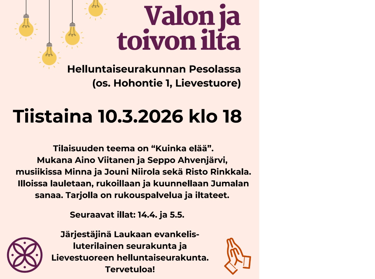 - Ti 10.3. klo 18 Valon ja Toivon Ilta.